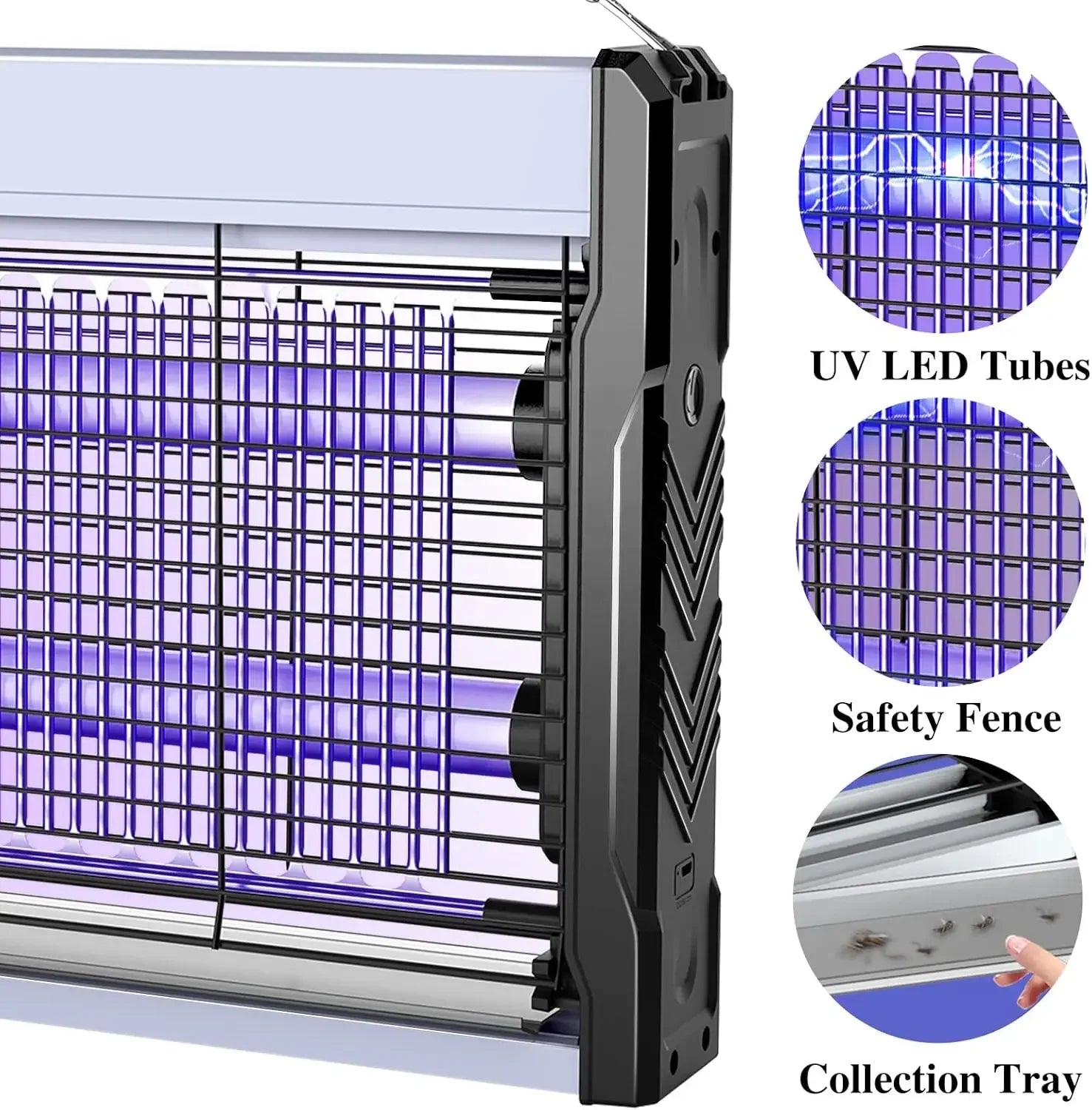 Easy to Clean: The bottom of bug zapper has a tray where dead insects can be collected. It is possible to remove and wash the collection tray. Additionally, the outer fence is also removable. The processes for cleaning are, to open the fence first, then clean the grid and bulbs with tissue or brush to let the dead body drop into the bottom tray, then remove and rinse the bottom tray, at last put them back together.