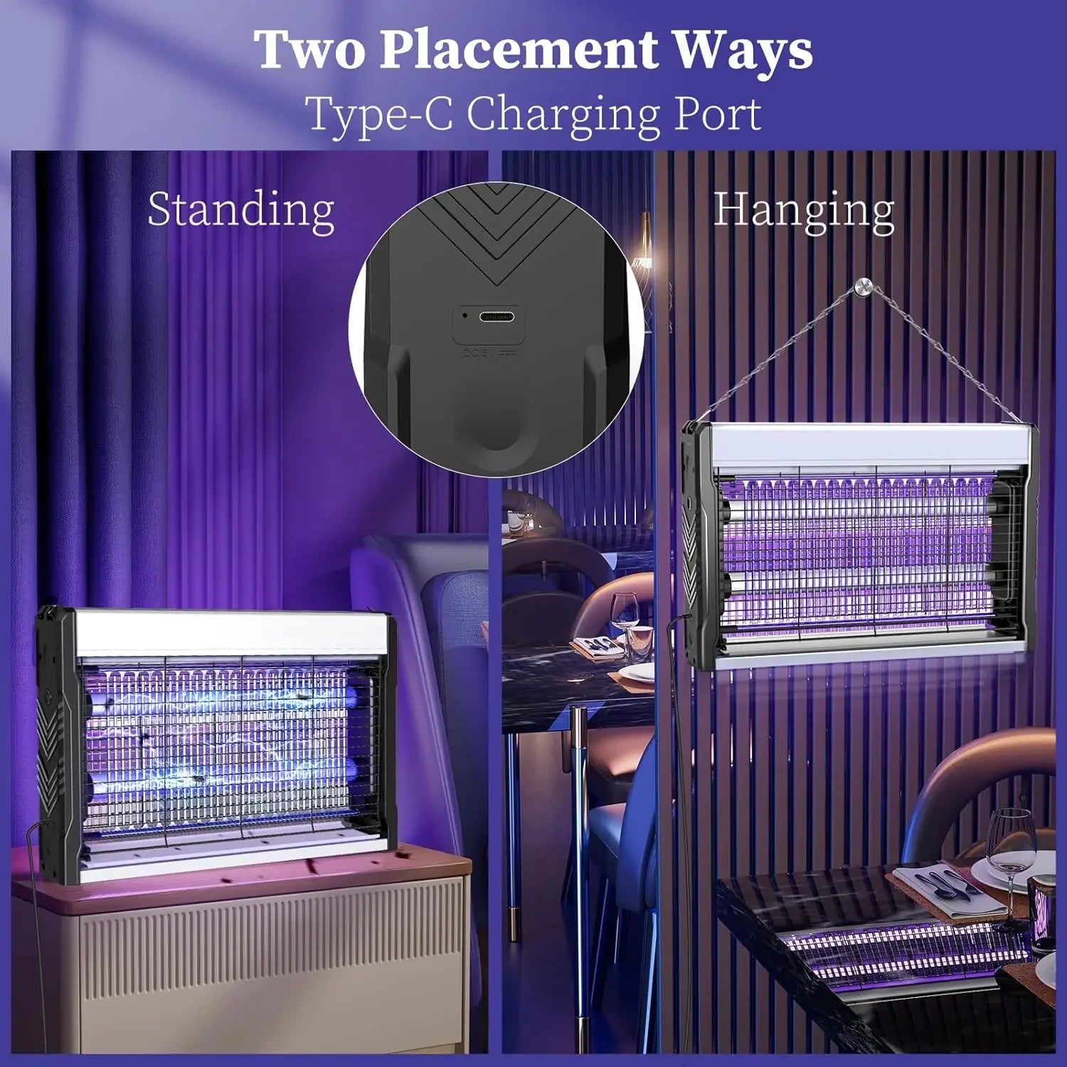 Easy to Use: Simply plug in the USB interface and start using. On the right side of the bug zapper are the power button and USB port. Additional USB cable of the bug zapper is white, about 59in/1.5m long. Note: Please place the mosquito trap on the flat surface. If you want to hang the bug zapper on the wall, please make sure the chain has been mounted.