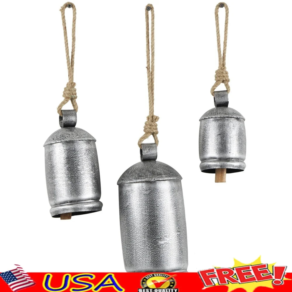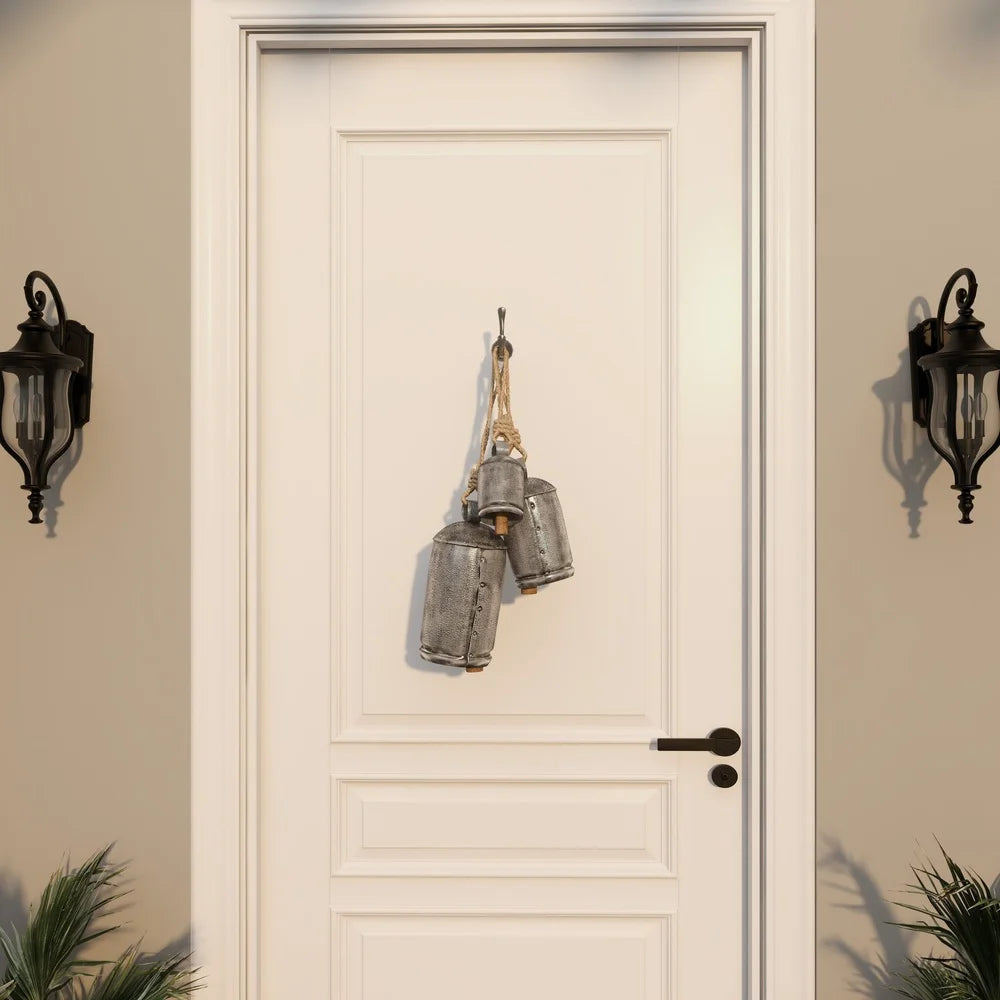 Gray Metal Tibetan Inspired Decorative Cow Bell Chime Set of 3 Indoor Outdoor Rustic Hanging Bells Home Meditation Decor